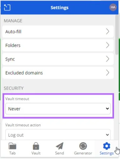 Once you get signed into the extension, and click on the settings tab. If you are working on a secure computer, you can change the “Vault Timeout” to “Never” which will keep you signed in unless you manually sign out.